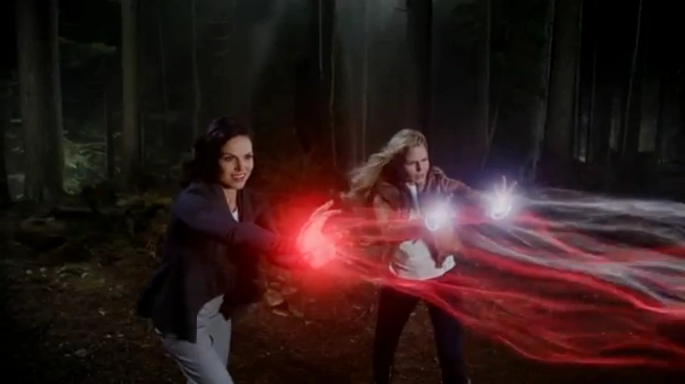 Emma y Regina combinan sus poderes, Magia de Luz y de Oscuridad, respectivamente.