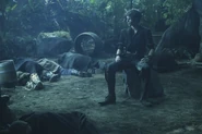 De leur côté, le groupe arrive à l'ancienne cachette de Baelfire, dont David actionne l'ouverture en tirant sur une corde. Soucieux de son état, Crochet l'aborde discrètement, tandis que les femmes pénètrent à l'intérieur de la grotte, demandant pourquoi il ne dit rien à sa famille. Assez étonné de son attitude, il se justifie qu'il ne veut pas leur donner de faux espoirs d'une guérison au lieu de d'abord sauver Henry, le pirate confirmant qu'il ne quittera jamais l'île vivant à cause du poison. À l'intérieur, ils allument des torches, révélant des inscriptions à la craie sur les parois de la caverne, parmi lesquelles ils espèrent trouver un indice sur le moyen dont s'est servi Baelfire pour s'enfuir du Pays Imaginaire.