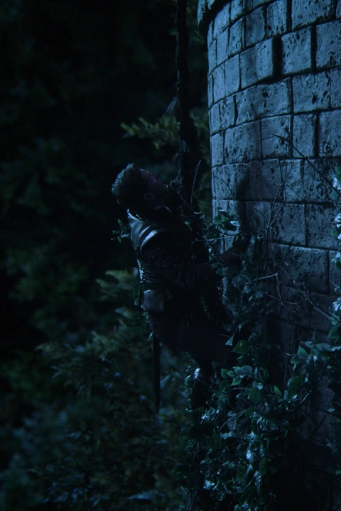 De son côté, David trouve à son tour les arbustes et s'enfonce encore dans les bois, mais il finit par ressentir une présence sinistre. En scrutant autour de lui, il finit par repérer la silhouette encapuchonnée, qui l'observe derrière des arbres. Il glisse donc la main dans sa poche pour récupérer son téléphone, mais Emma ne répond pas à son appel. Il lui laisse quand même un message vocal, expliquant qu'il a peut-être trouvé la Sorcière, et qu'il compte la poursuivre. Épée à la main, il s'avance discrètement, mais une fois au niveau de l'arbre, le coup qu'il porte se plante dans le tronc, sans rien toucher. David pense alors avoir rêvé, et se retourne vers son point de départ, mais la silhouette en capuche se tient devant lui, le saisit au corps et le lance vers un autre arbre, assommant l'homme un instant, tombé à terre.