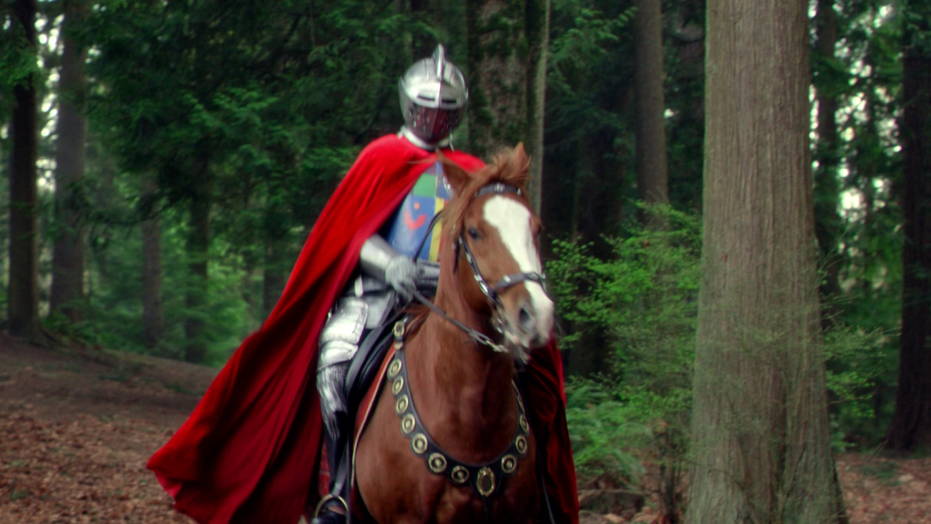 Looking for a reliquary that supposedly went missing, David gathers the Camelot citizens to uncover the identity of the thief. Among the murmuring crowd, a horse neighs as Grif rides off. Arthur and David enter the latter's truck and pursue the squire. Using a wooden plank as a joust, David knocks Grif off his horse. ("Siege Perilous")