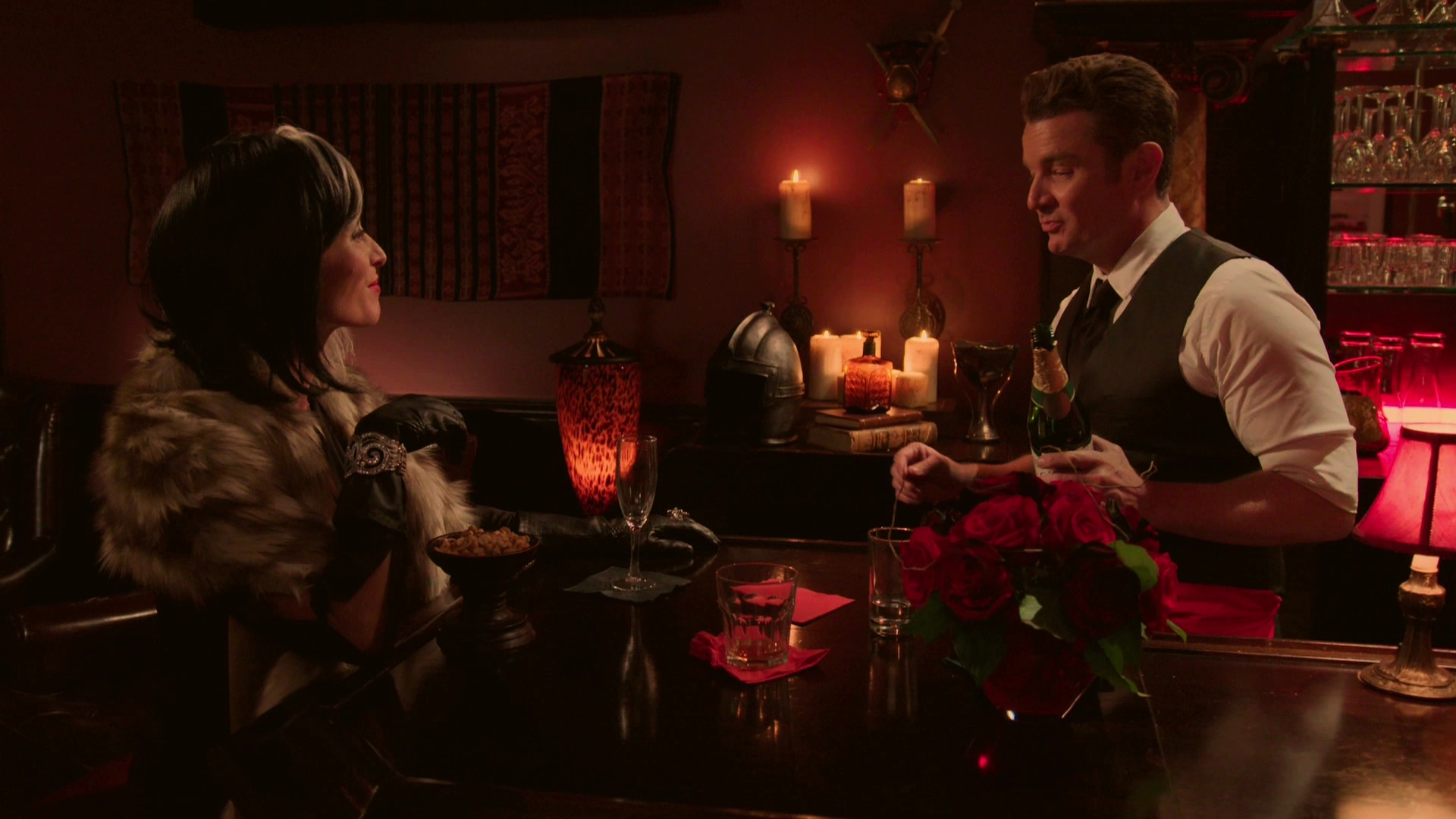 Suddenly remembering how her conversation with Mordred started, Cruella asks where she is and what she's doing there. Mordred informs her that she was celebrating fifty years since Arthur took over the Underworld. She wishes Mordred a happy anniversary but he walks away before she can clink their glasses together, leaving her to drink alone.